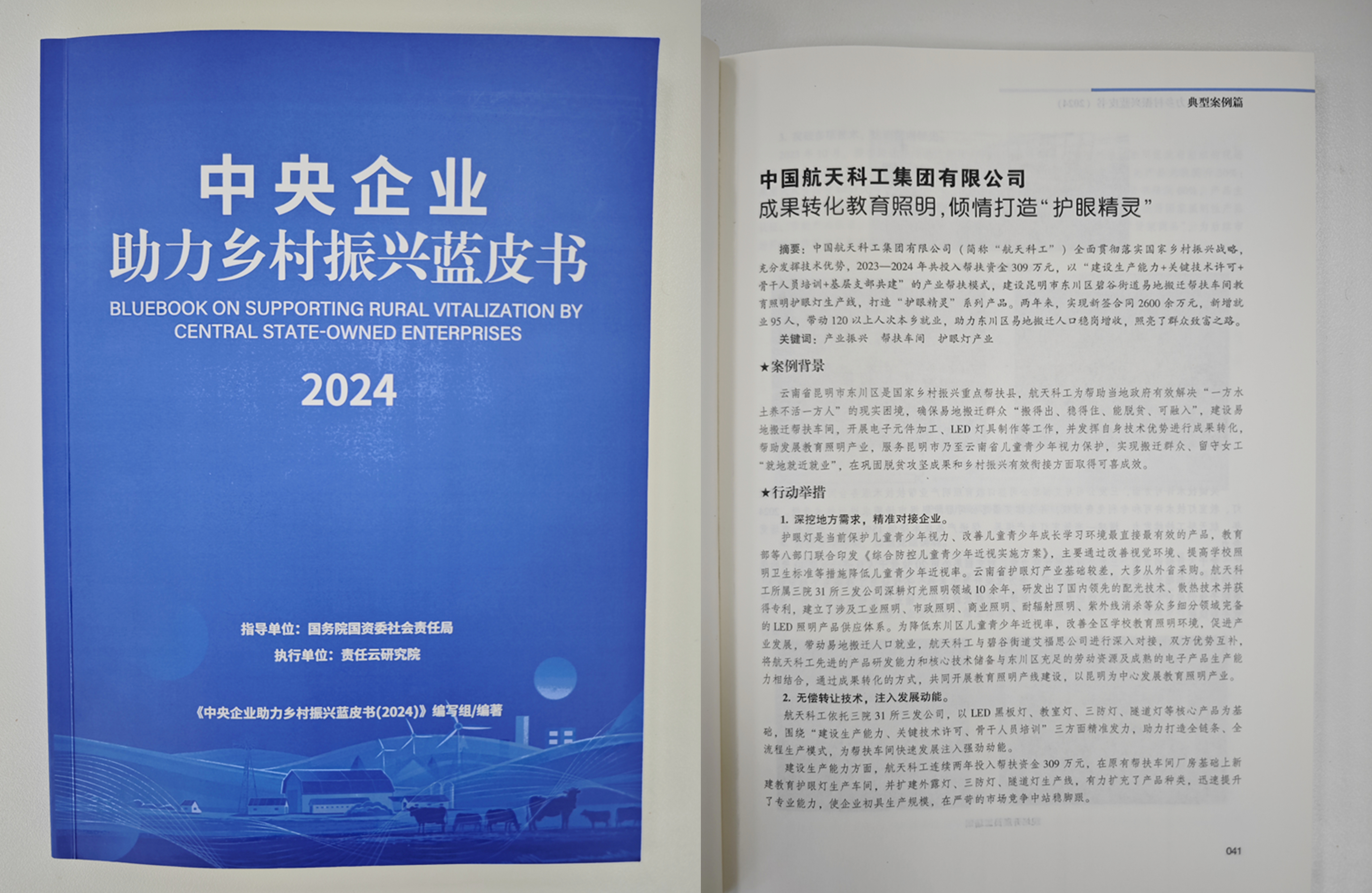 國務院國資委同步發布了《中央企業助力鄉村振興藍皮書(2024)》,集團公司《成果轉化教育照明,傾情打造“護眼精靈”》案例入選。該案例中,集團公司充分發揮技術優勢,以“建設生產能力+關鍵技術許可+骨干人員培訓+基層黨支部共建”的產業幫扶模式,建成昆明市東川區碧谷街道易地搬遷幫扶車間教育照明護眼燈生產線,打造“護眼精靈”系列產品。兩年來,實現新簽合同2600余萬元,新增就業95人,帶動120以上人次本鄉就業,助力實現東川區易地搬遷人口穩崗增收,照亮了群眾致富之路。本項目是集團公司堅持“地方所需、航天所能”,促進幫扶地區產業發展,實現特色產業跨區域轉移的示范案例。