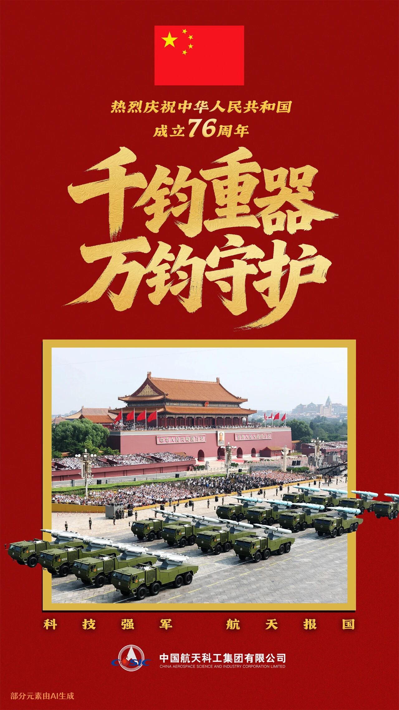 今天,中國航天人祝福偉大祖國繁榮昌盛,祝福偉大人民幸福安康。聽黨指揮,為國鑄劍,千鈞重器,萬鈞守護。(海報/張彤 文案/韓超)