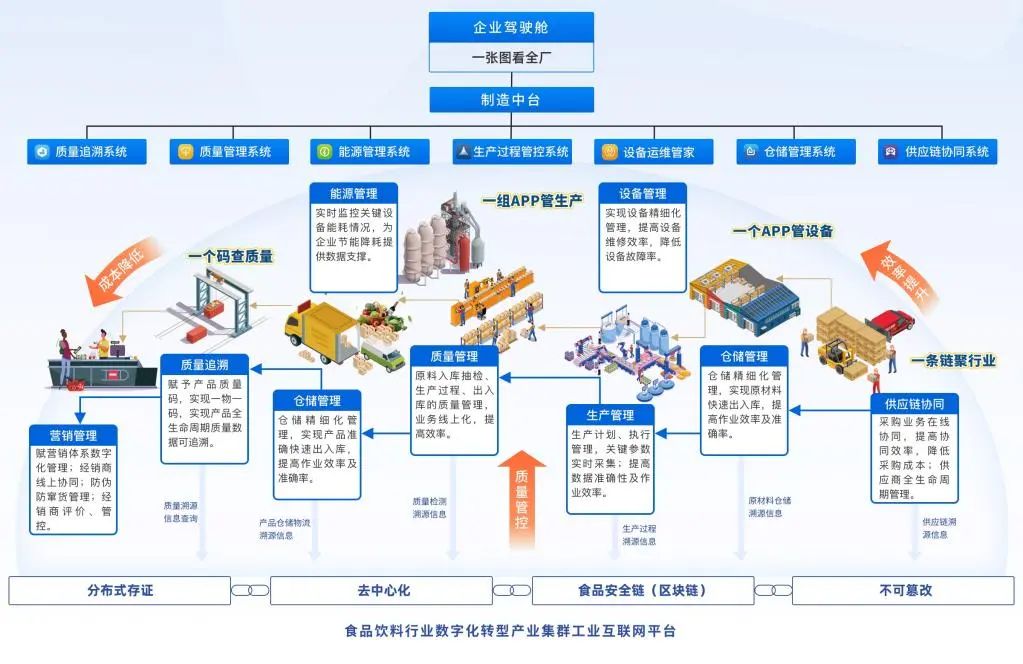 航天云網公司自主開發的“食品飲料行業數字化轉型(全域)解決方案”聚焦食品企業關注提升生產效率、降低運營成本、加強質量管控等需求,從產品鏈和價值鏈深度融合的角度出發,提供數字化轉型全域解決方案,涵蓋產品全生命周期管理系統、銷售管理系統、供應鏈協同系統、生產過程管控系統、質量管理系統、質量溯源系統、設備運維管家、能源優化系統、倉儲管理系統、成本分析系統等12款應用系統產品集。目前,該方案已賦能廣東、貴州、甘肅等多個省市數十家企業實現數字化轉型,助力制糖、飲用水、食品添加劑、飲料、啤酒等細分行業企業實現提質降本增效。