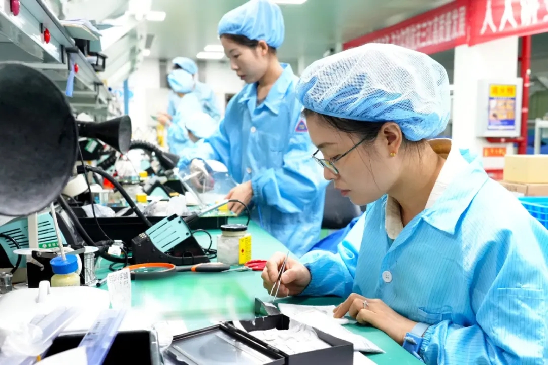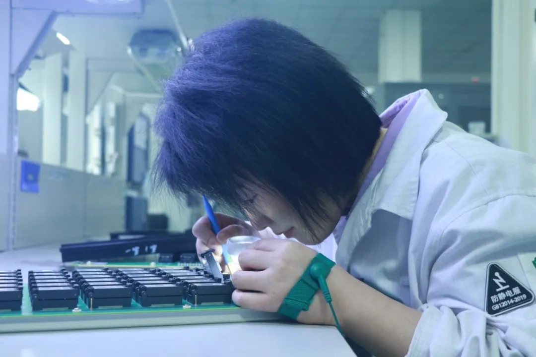 走進班組工作區,師傅們眼神專注而堅定,目光緊盯電路板,手臂平穩移動,烙鐵在指尖靈活運轉。在她們手中,烙鐵仿佛畫筆,在電路板上勾勒出一個個完美的焊點。