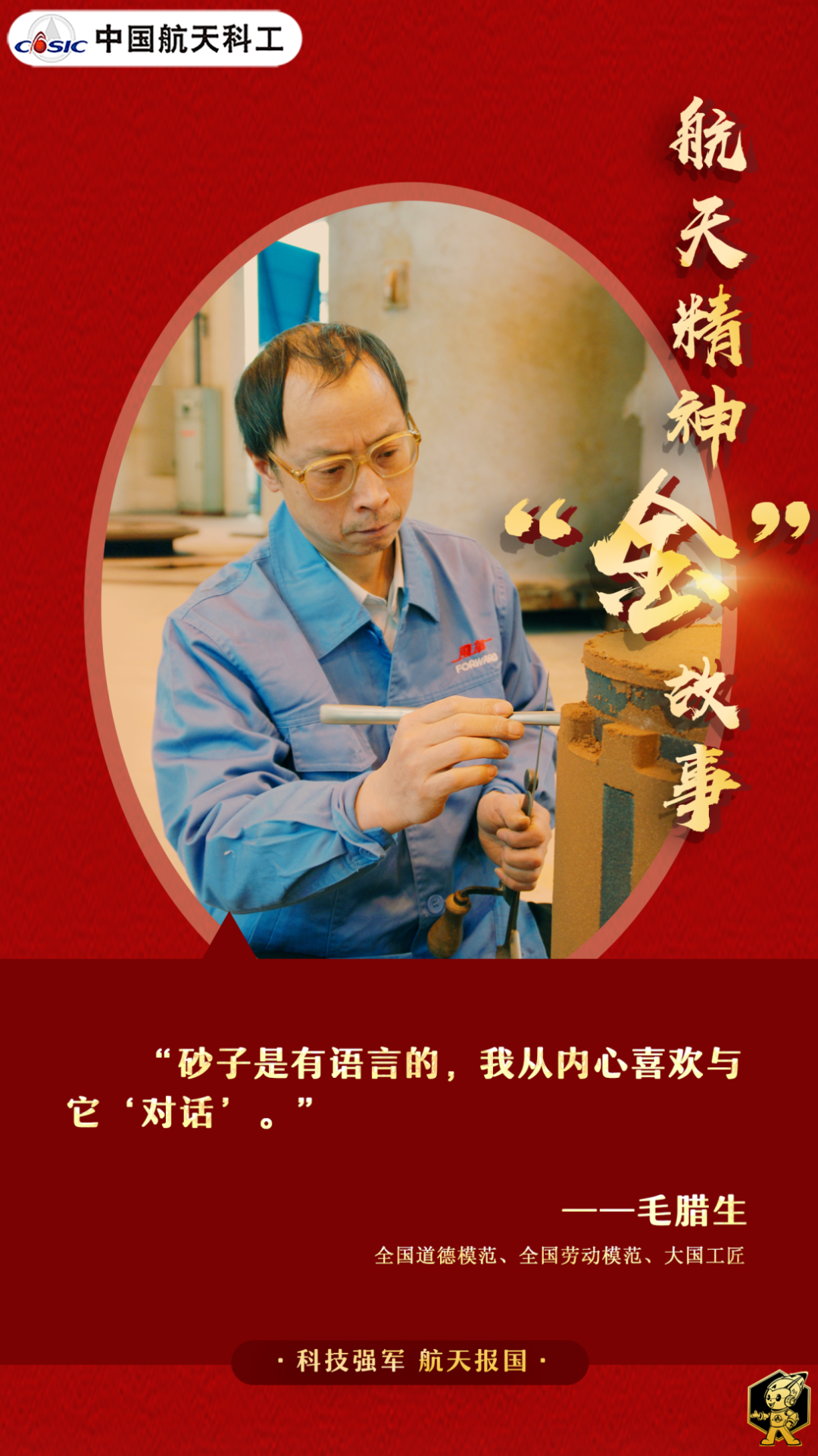 “只要祖國需要、航天需要,一定到!”面對航天事業新征程上一流專業建設的號召,現在67歲的“航天老兵”毛臘生再次“入伍”,返崗一線繼續與砂子“對話”。(海報/張彤 文/李慶華)