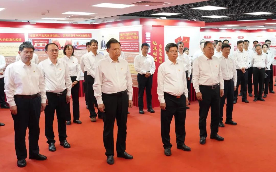 集團公司黨組一行認真聆聽講解,深入學習交流。從“政治鑄魂——習近平總書記重要論述”“紀法樹威——黨規黨紀相關要求”“傳承增信——黨的優良傳統”,到“嚴管促行——國務院國資委黨委紀律建設成效”“警示立戒——反面典型案例”“實干建功——工作展望”,大家通過觀看圖文、視頻、實物等形式多樣的展品展示,進一步學習領會習近平總書記關于國資央企的重要指示批示精神和黨的紀律建設的重要論述,學習把握《中國共產黨紀律處分條例》新增、修訂內容,全面了解國務院國資委黨委強化政治引領、加強政治監督、深化紀律建設、抓實巡視工作等方面的做法舉措,集中觀看近年來國資央企發生的具有代表性的違規違紀案例。
