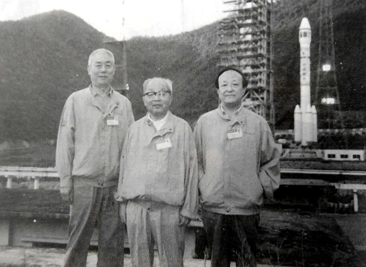 1992年8月9日,屠守鍔(中)在長(zhǎng)征二號(hào)E運(yùn)載火箭發(fā)射現(xiàn)場(chǎng)