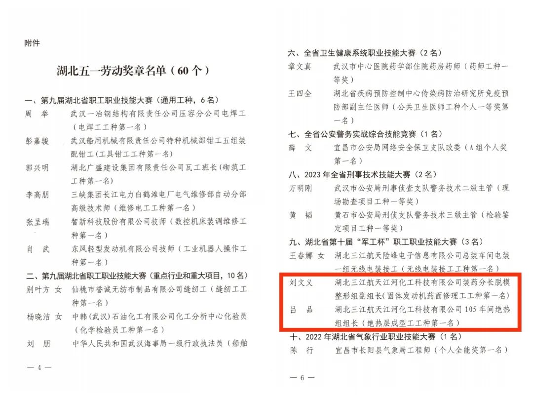 近日,從湖北省總工會《關于2022年-2023年部分專項活動先進個人和集體授予湖北五一勞動獎章和湖北省工人先鋒號的通報》(鄂工字[2023]59號文)獲悉,中國航天科工六院江河公司職工呂品和劉文義因在湖北省第十屆“軍工杯”職工職業技能大賽中獲第一名,被授予“湖北五一勞動獎章”殊榮。