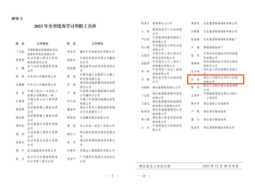 同時,從湖北省總工會《關于命名2023年荊楚工匠學院暨表揚省級優秀帶徒名師、學習型職工的通報》(鄂工字[2023]57號文)獲悉,公司職工呂品喜獲2023年湖北省“優秀學習型職工”榮譽稱號。