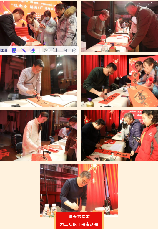 來自中國(guó)航天書法家協(xié)會(huì)、中國(guó)公安書法家協(xié)會(huì)、中國(guó)金融書法家協(xié)會(huì)的書法家以及航天科技五院、九院和航天科工二院、三院的七位航天書法家為二院職工送來了新春的祝福。