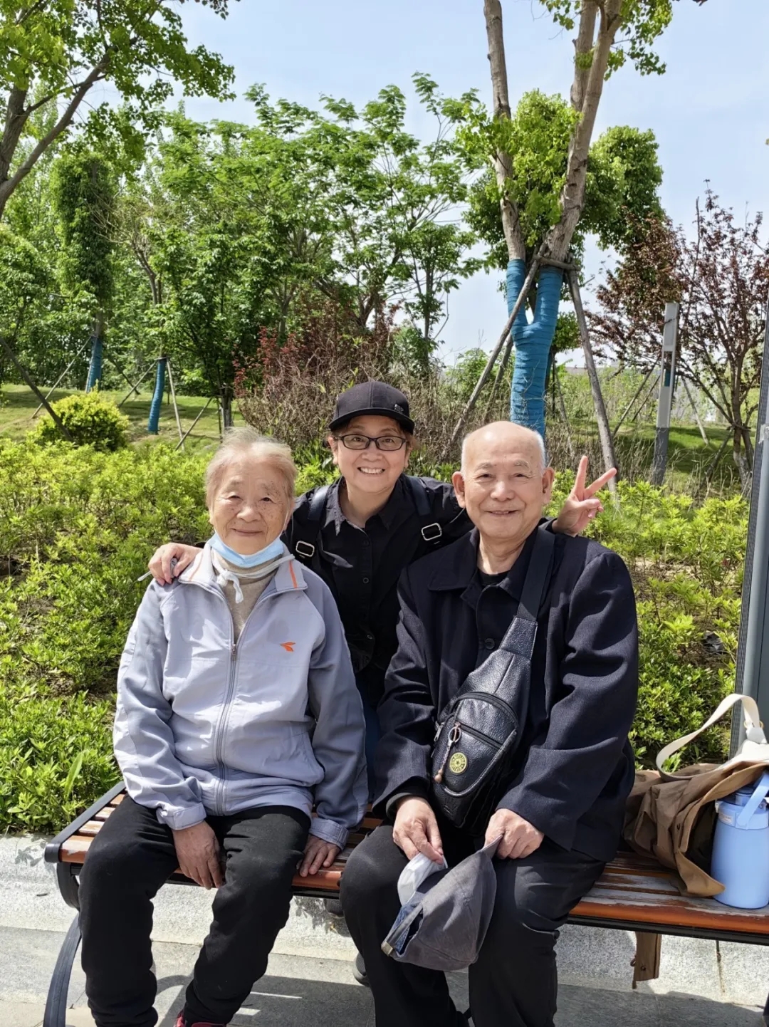 樊萬琴(左一)與丈夫、二女兒逛公園