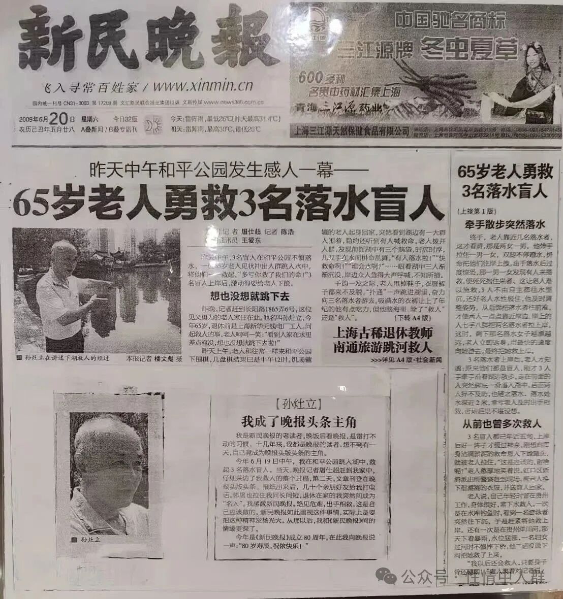 這已是孫灶立第二次水中救人。早在2009年,時年65歲的他就在上海和平公園,從2米多深的湖中成功救起三名落水的盲人,事跡獲《新民晚報》等媒體廣泛報道。從花甲到耄耋,歲月流轉不改英雄本色,兩次義舉映照赤誠初心。